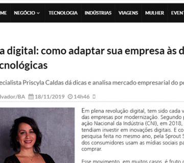 Era digital: como adaptar sua empresa às demandas tecnológicasAdmin20 de novembro de 2019Em entrevista para canais de comunicação, como: Negócios em Foco, Bahia Social, Diga Salvador, Juci Ribeiro, Criativa Online, Aldeia Nago, ... Leia mais