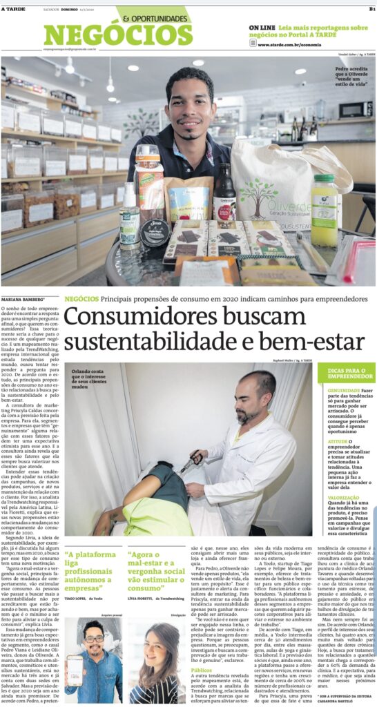 Em entrevista ao Jornal A Tarde, Priscyla Caldas, comentou sobre como os empreendedores podem conquistar o sucesso com as principais tendências de consumo de 2020. Junto com ela, Dr. Orlando Tavares da Acupuntura Tavares, também contribuiu com a reportagem.